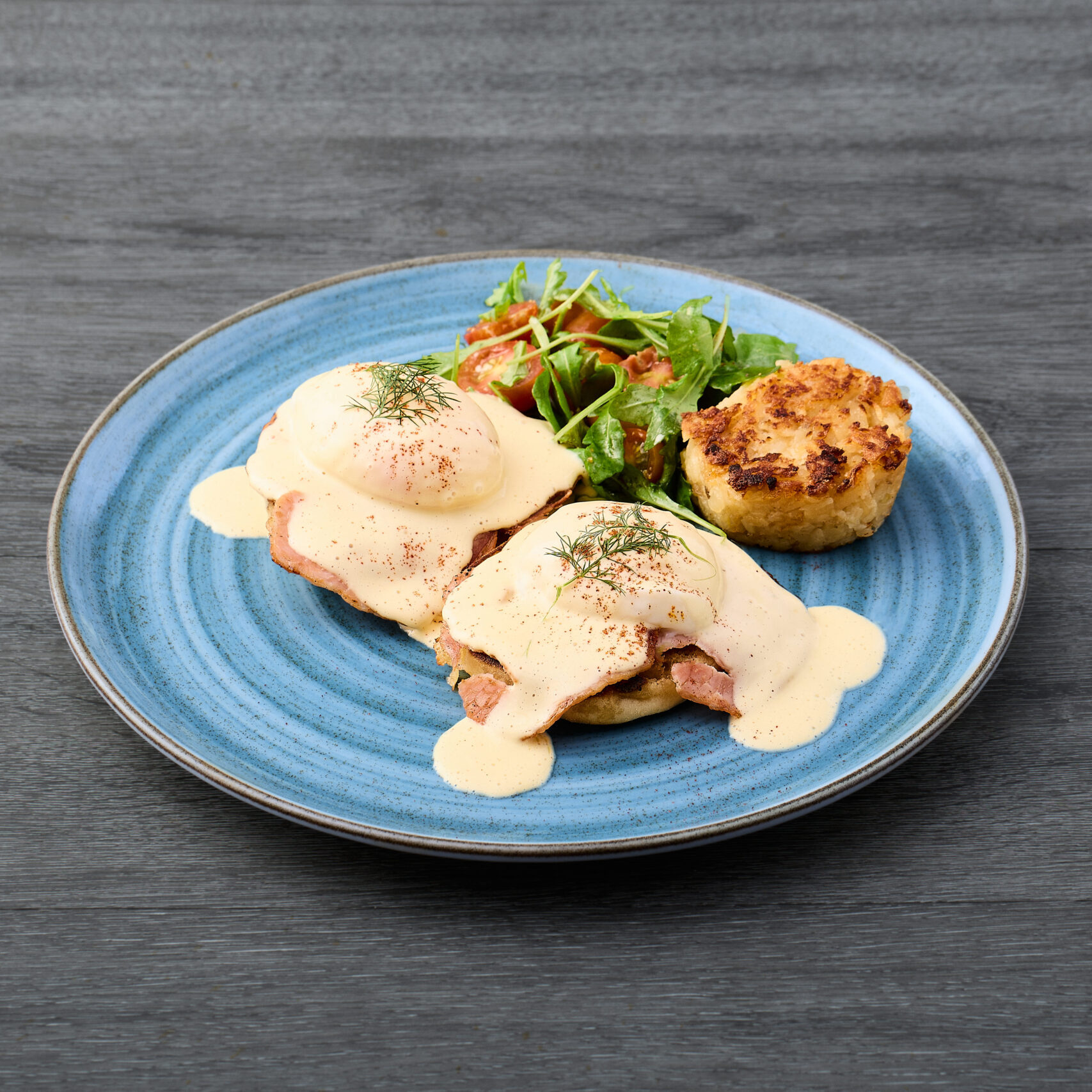 two English muffins with poached eggs and grilled Canadian bacon, served with hollandaise sauce, accompanied by a baked potato & apple hash brown
