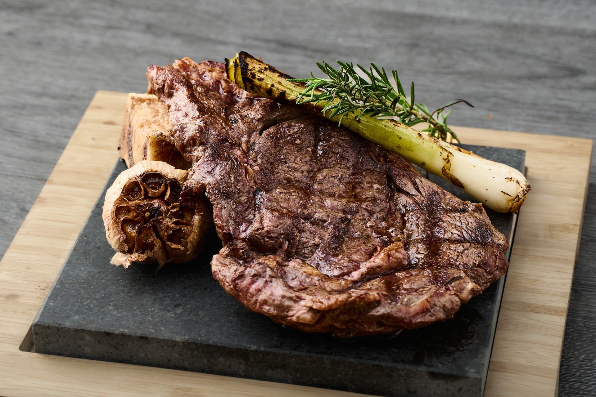 Los cortes de entraña y rib eye vienen acompañadas de tuétano rostizado, cebollina y ajo rostizado.