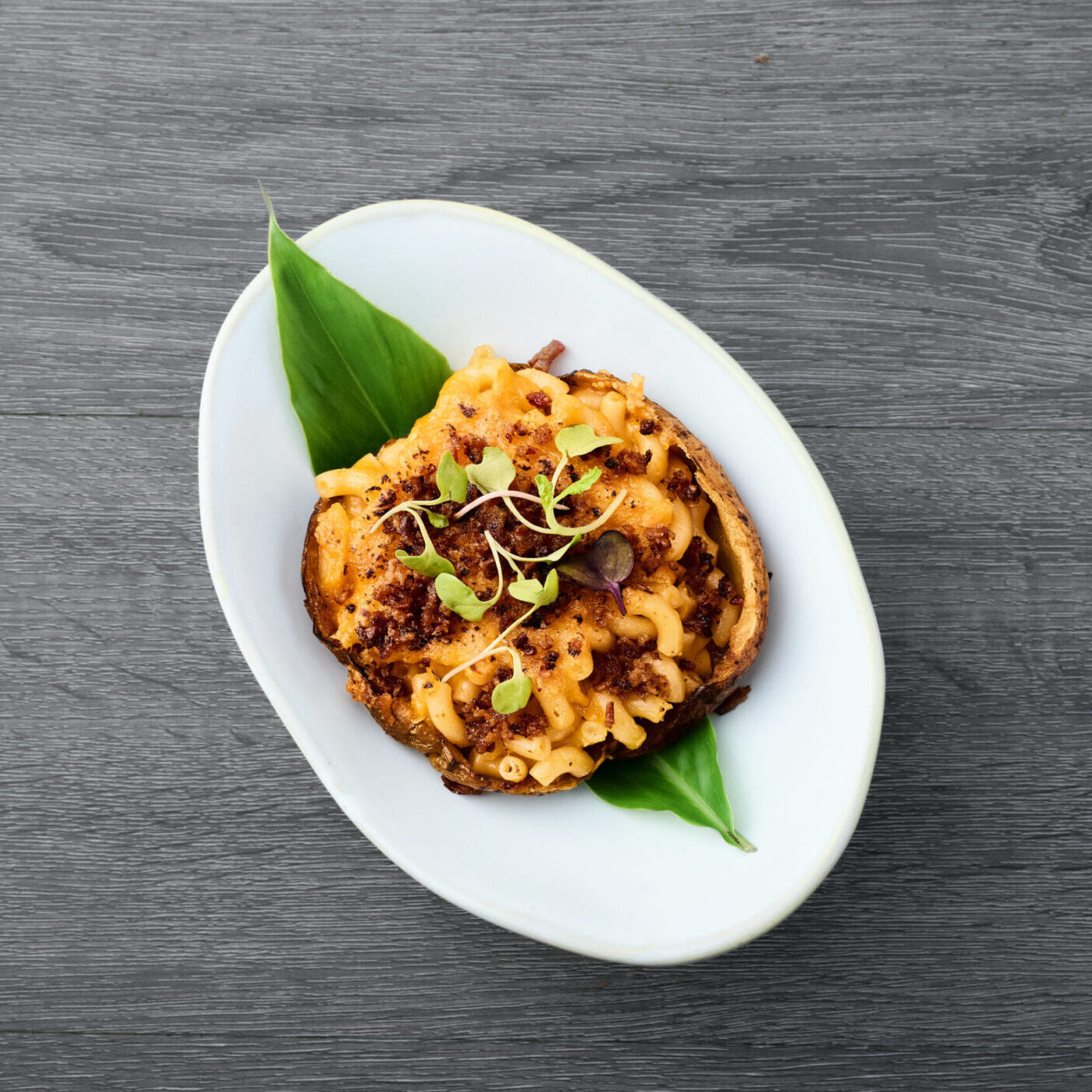 Cáscara de papa rellena de Mac & Cheese