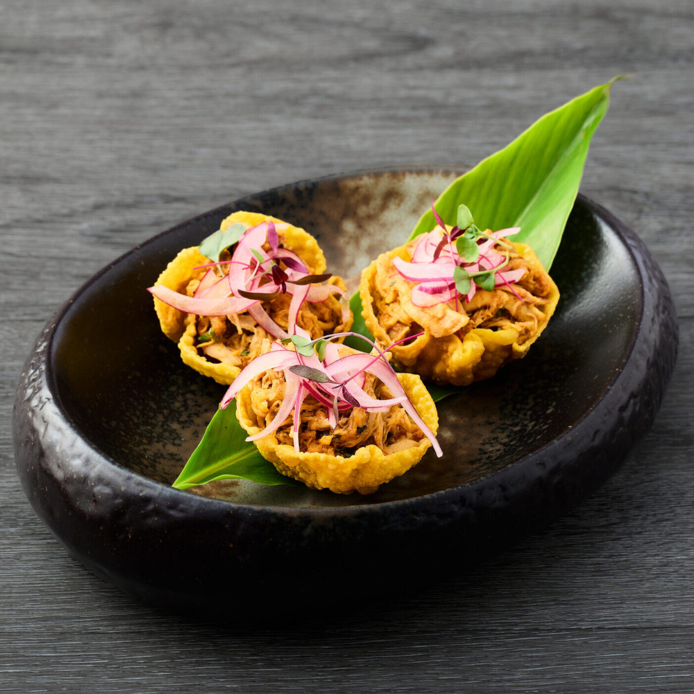 crujientes wontones rellenos de tierno lechón en adobo, con especias criollas, cebolla morada encurtida y una salsa de mango dulce-picante