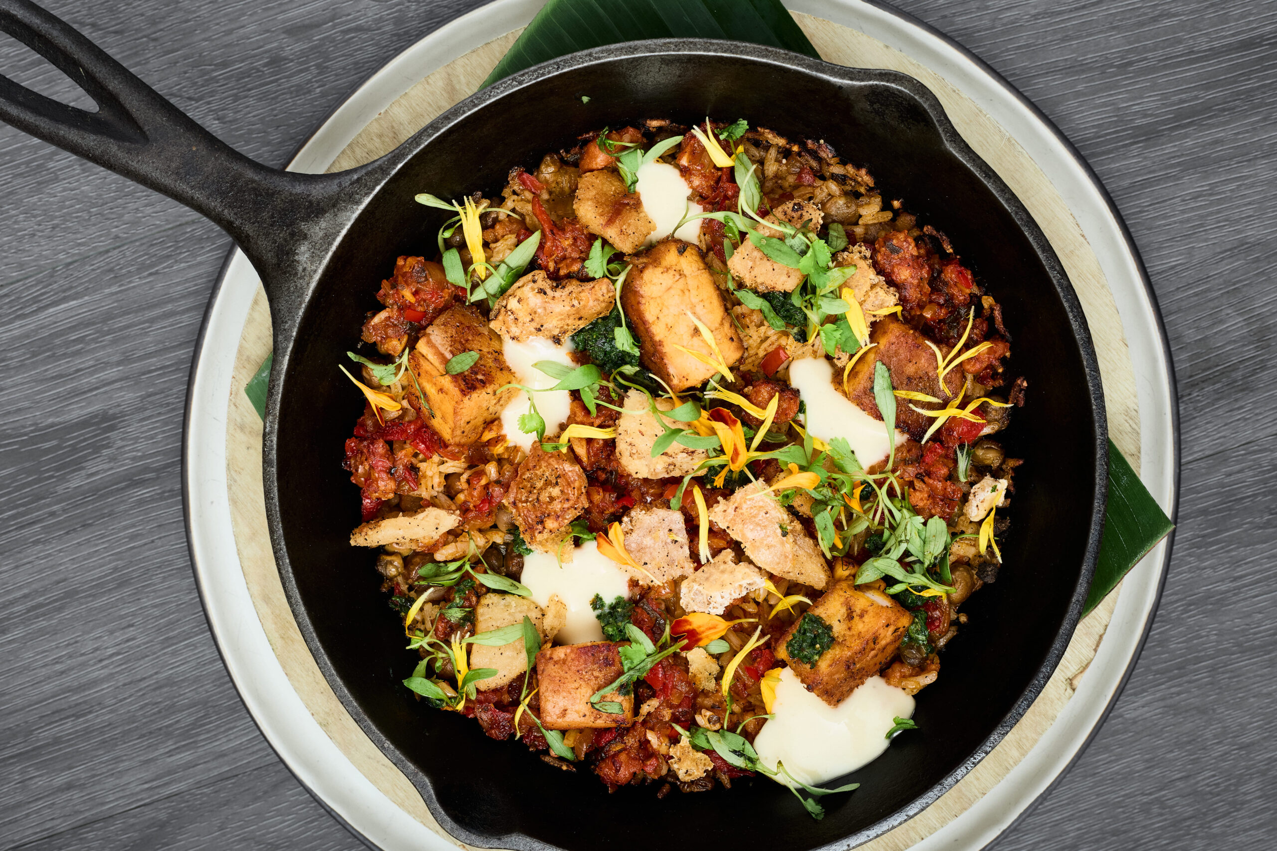 Servido con tierno cerdo braceado al horno y sus chicharrones, sobre concolón de guandú con sofrito panameño
