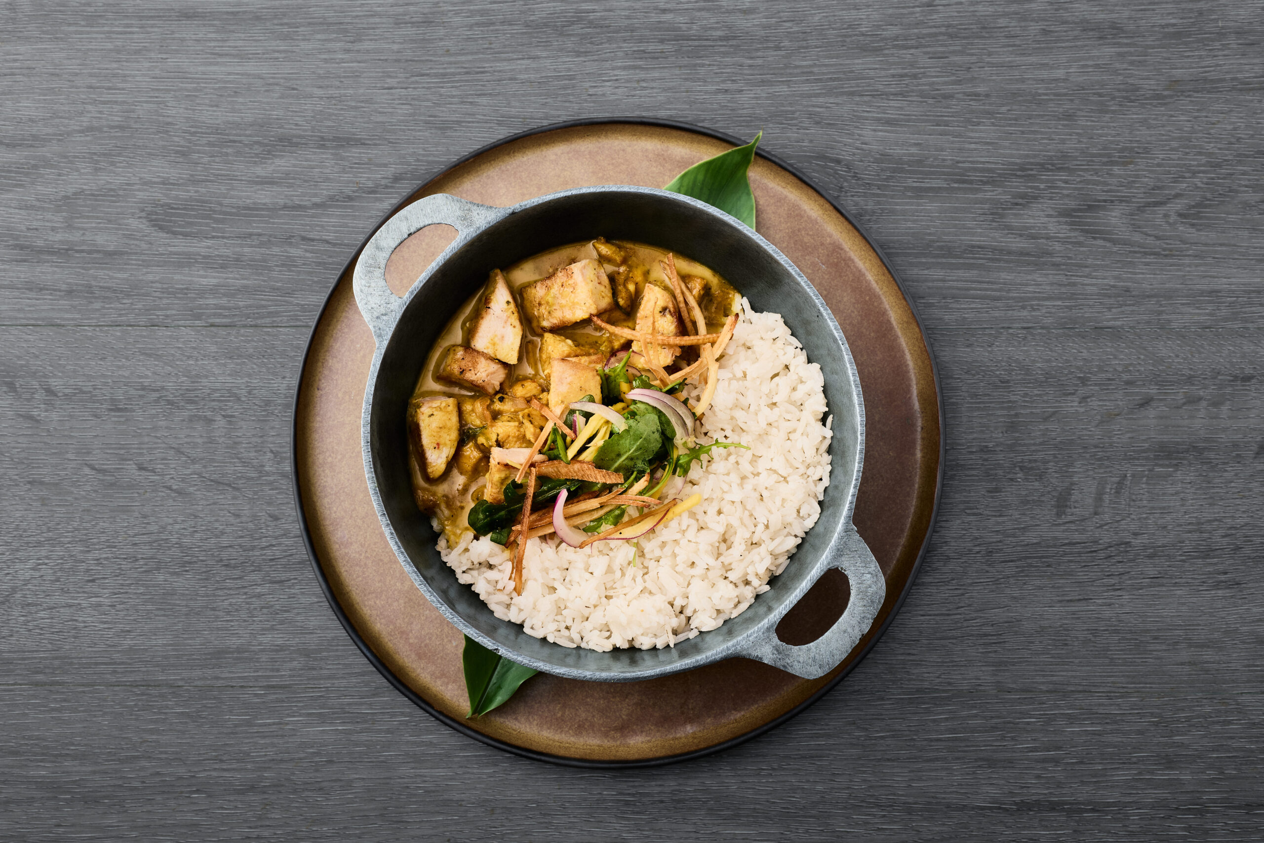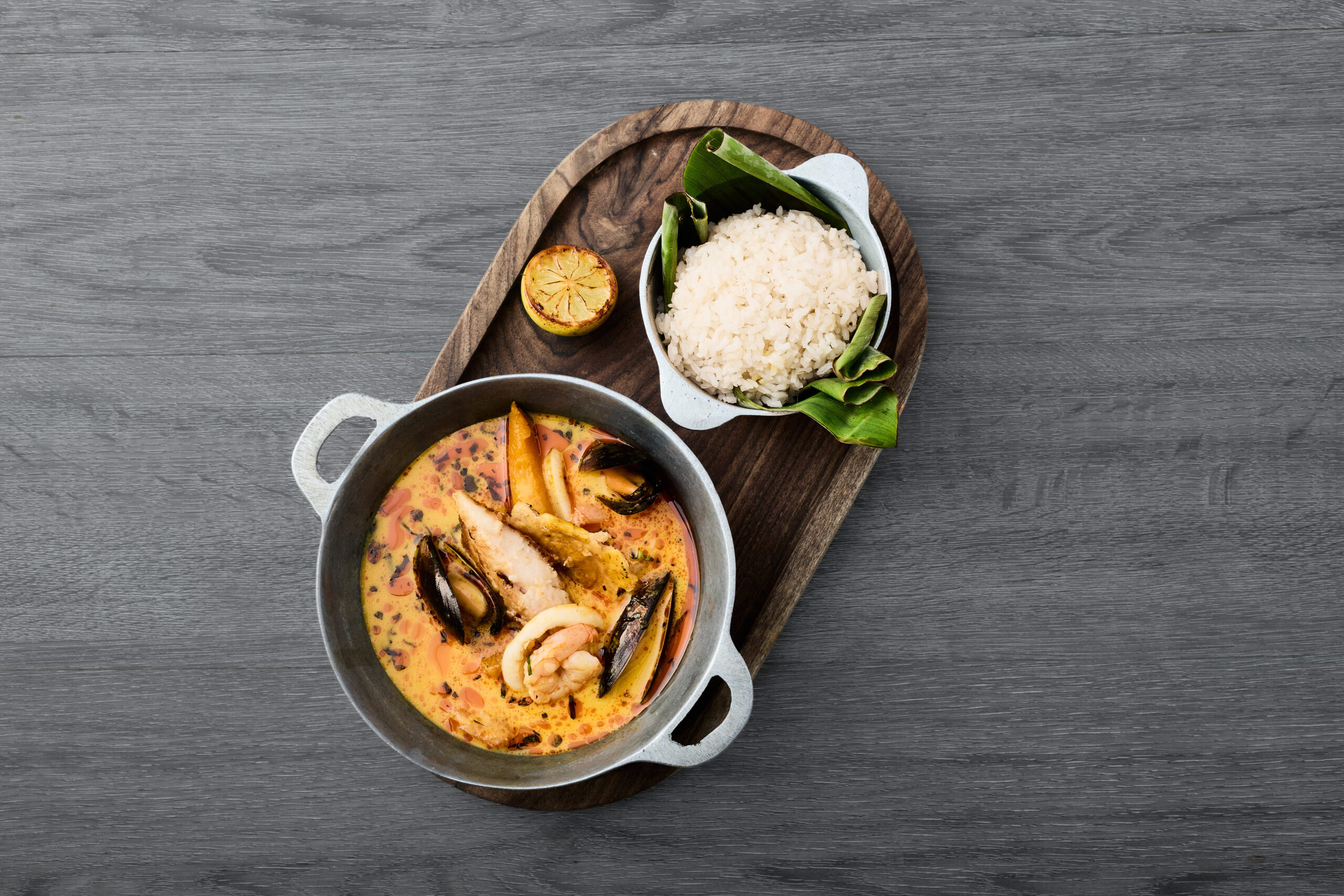 paila de curry panameño preparado con leche de coco, acompañado de arroz blanco al vapor